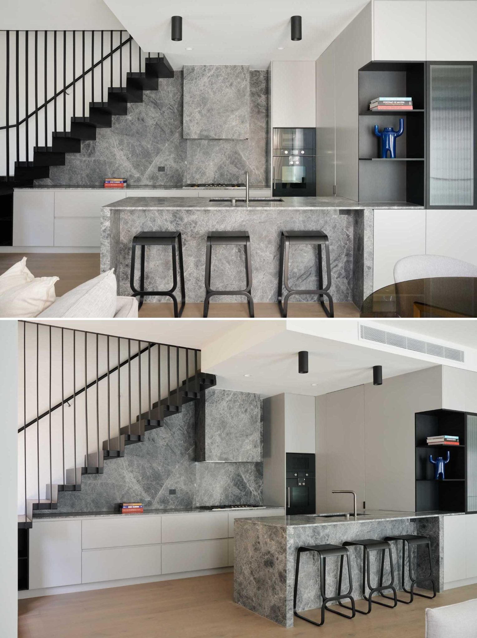 Cầu thang màu tối với tay vịn phù hợp kết nối các tầng khác nhau trong căn nhà, mang lại yếu tố tương phản với nội thất trung tính.