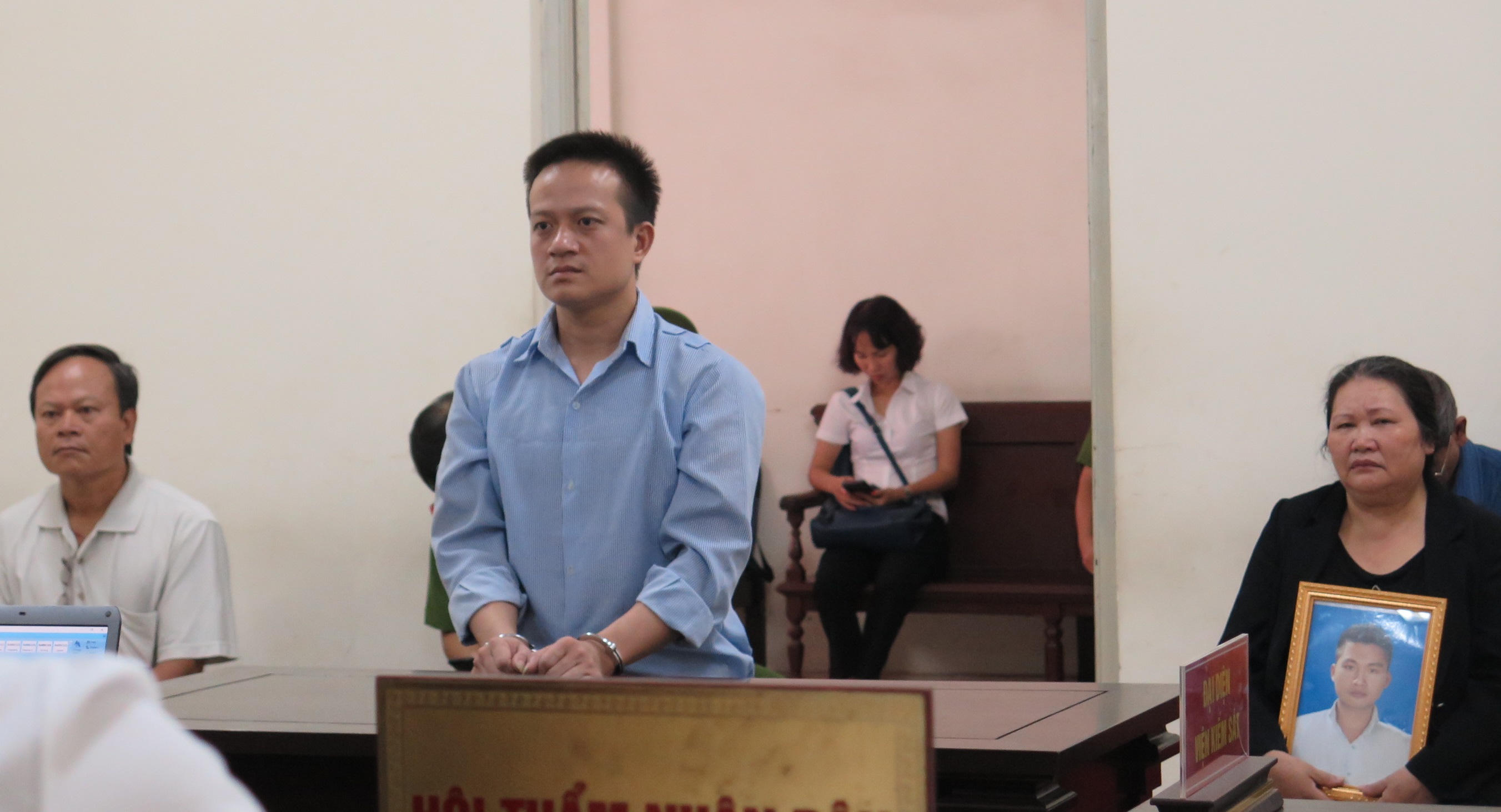 Ngay từ sáng sớm, bị cáo đã được dẫn giải tới tòa. Ít phút sau, người thân của bị cáo và bị hại xuất hiện bên ngoài phòng xử. Trên tay mẹ bị hại là di ảnh của con trai.