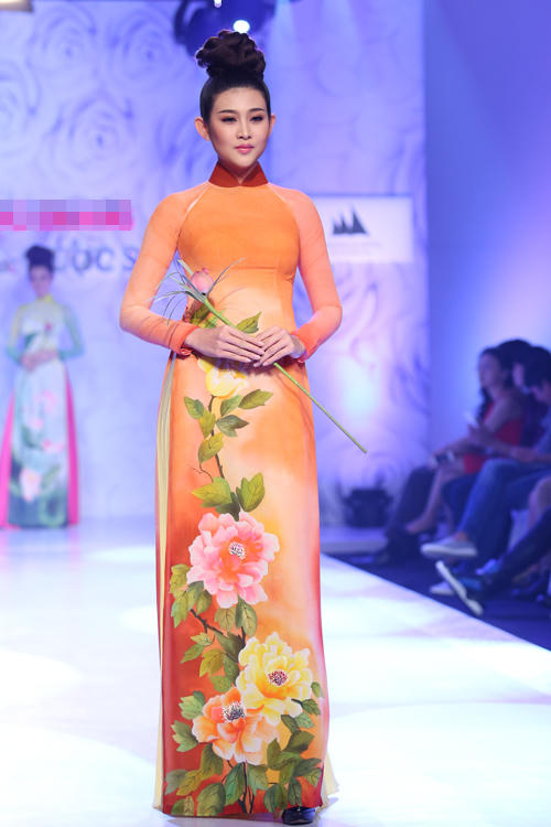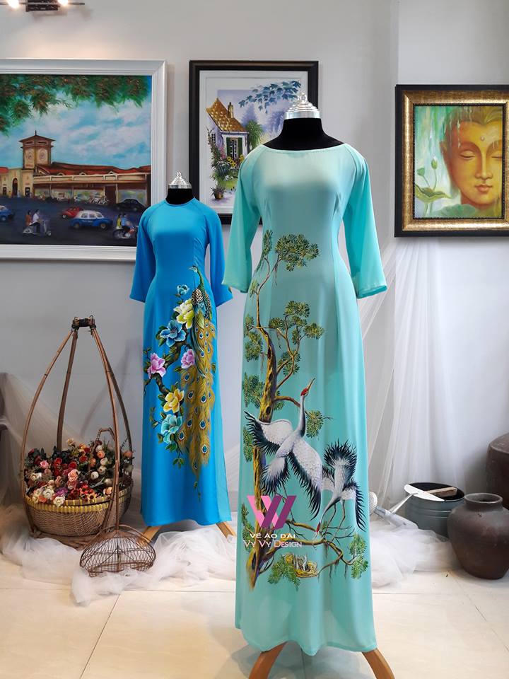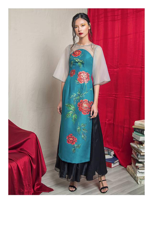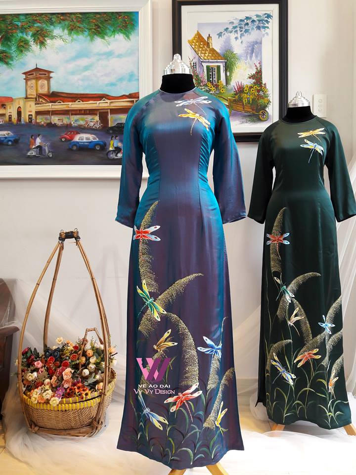 Mẫu áo dài nghệ thuật của thương hiệu Vy Vy Design. Thương hiệu này đánh mạnh vào việc khai thác nghệ thuật vẽ tay thủ công truyền thống.