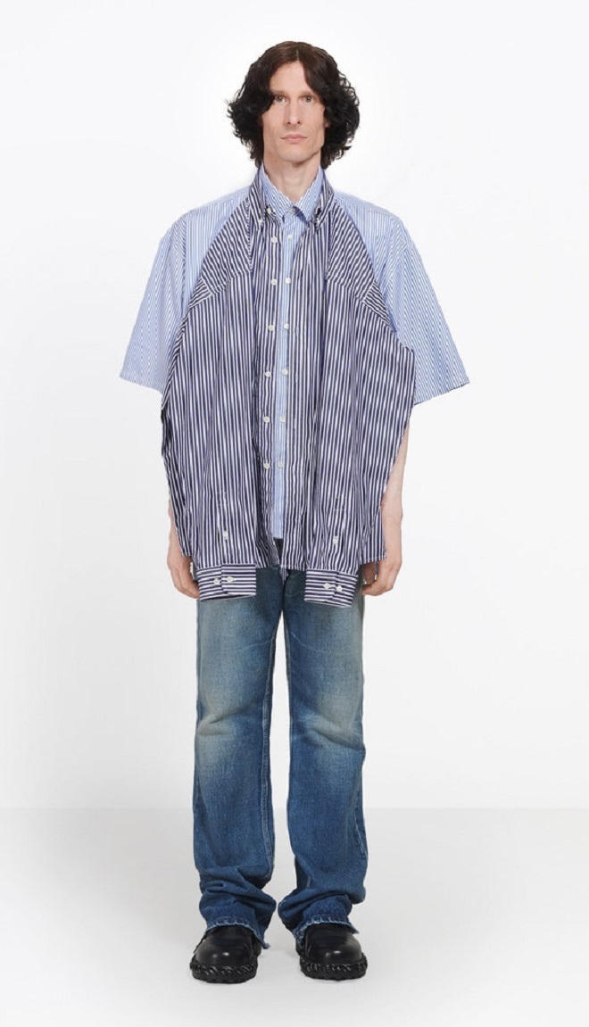 Mới đây, những nhà thiết kế của Balenciaga một lần nữa khiến không chỉ giới mộ điệu mà cả cộng đồng mạng bất ngờ khi tung ra chiếc áo kết hợp giữa sơ mi và T-shirt. Theo giới thiệu trên trang web chính thức, chiếc áo này có thể mặc cả phần sơ mi và áo thun tay ngắn để từ đó tạo nên những kiểu dáng khác nhau. Kiểu áo “2 trong 1” này có lẽ là thiết kế tiện dụng và tiết kiệm nhất mà Balenciaga sáng tạo ra.