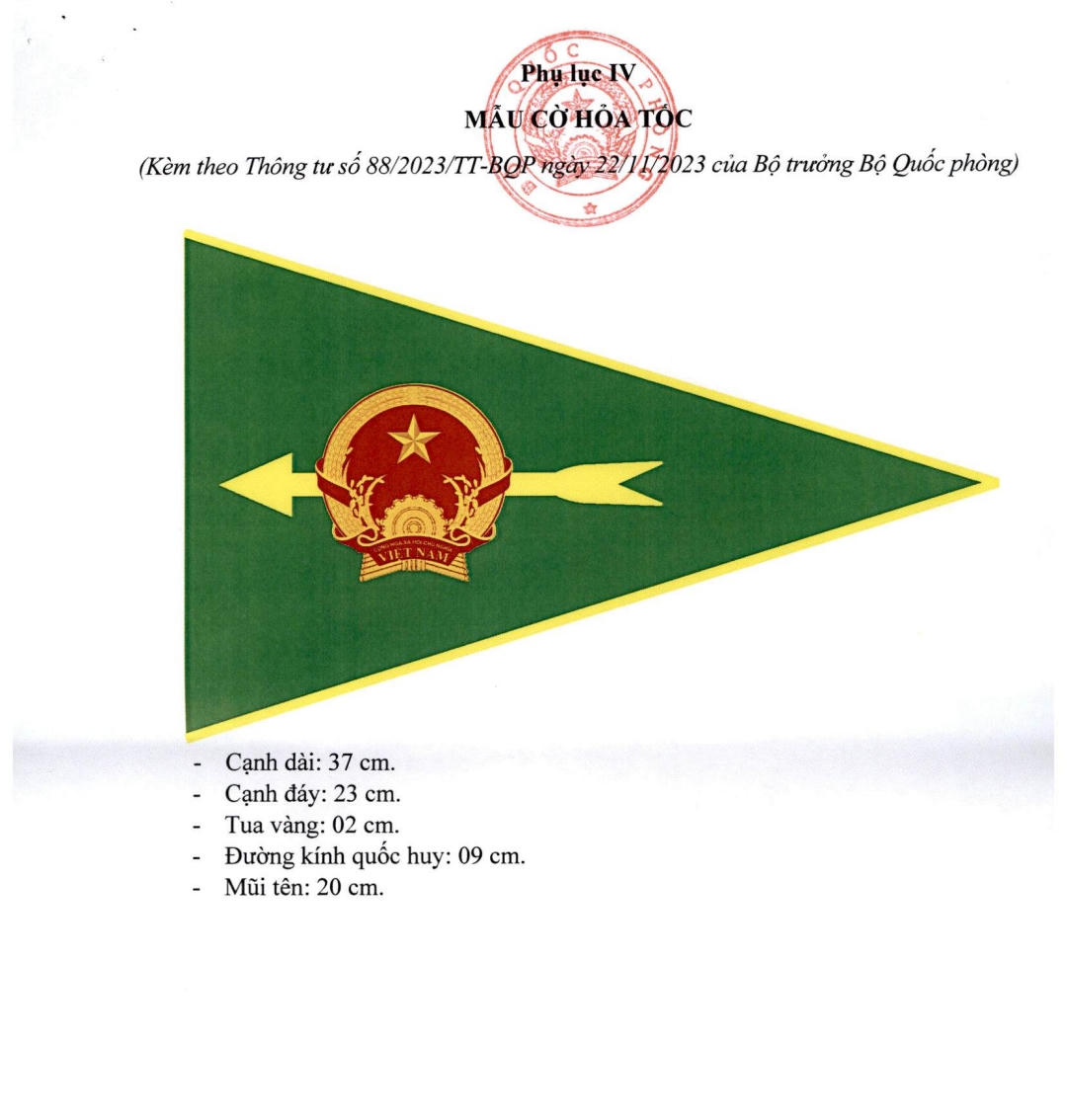 Cờ hỏa tốc: Được làm bằng vải Polyester, hình tam giác cân, nền màu xanh lá cây, cạnh dài 37 cm, cạnh đáy 23 cm; có tua màu vàng 02 cm ở hai cạnh bên tam giác cân; ở giữa thêu hình Quốc huy, đường kính 09 cm, trên mũi tên màu vàng dài 20 cm hướng vào cạnh đáy tam giác. Cờ được treo trên cột cao 50 cm phía trước, bên trái theo chiều tiến của phương tiện và chỉ được dùng trong trường hợp làm nhiệm vụ khẩn cấp theo quy định của pháp luật và Bộ Quốc phòng.