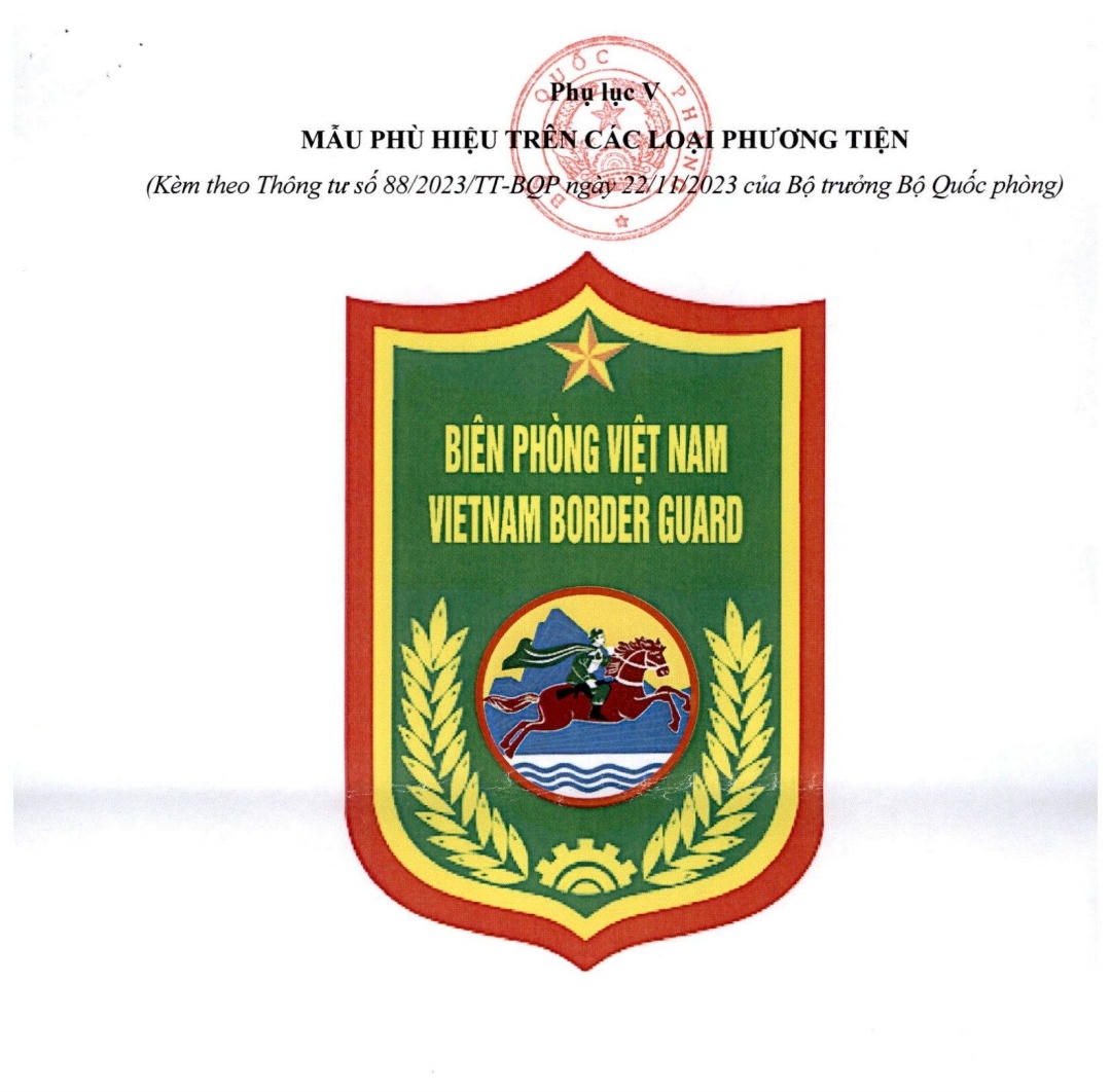 Phù hiệu: Hình khiên trên nền xanh lá cây, chiều ngang bằng 2/3 chiều cao, ngoài viền đỏ, trong viền vàng; phía trên có hình ngôi sao năm cánh màu vàng, ngay dưới ngôi sao là hai dòng chữ “BIÊN PHÒNG VIỆT NAM” và “VIETNAM BORDER GUARD”, kiểu chữ in hoa, phông tiếng Việt “VnHelvetlnsH” màu vàng; ở giữa có hình tròn nhỏ viền đỏ; bên trong là hình chiến sĩ Biên phòng cưỡi ngựa, phía dưới là ba rãnh hình cánh sóng; dưới phù hiệu có hình bông lúa, ở giữa phía dưới hai bông lúa có hình nửa bánh răng màu vàng; chiều cao hình khiên cao bằng 2/5 chiều cao của vị trí sơn, dán trên phương tiện.