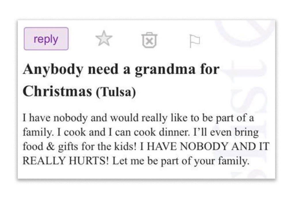 Với tiêu đề “Có ai cần một bà già Noel không?”, còn phần nội dung ghi rõ rằng ràng: “Tôi không có ai thân thích và rất muốn là một phần của gia đình. Tôi có thể nấu ăn. Tôi thậm chí có thể mang đồ ăn và quà cho những đứa trẻ. Tôi không có ai bên cạnh và điều đó thật đau lòng. Hãy cho tôi là một phần trong nhà bạn”, bà viết trên Craigslist. Chỉ có vài dòng ngắn ngủi nhưng bài viết của bà đã khiến nhiều người đặc biệt chú ý.