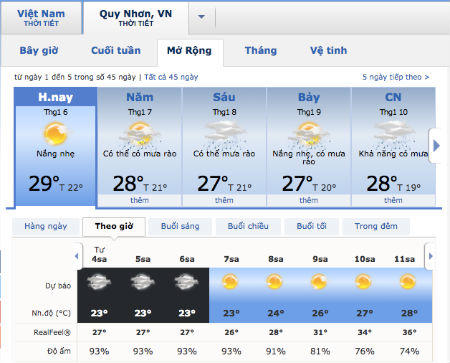 Theo trang thời tiết Accuweather, thời tiết tại Quy Nhơn (Bình Định) trong sáng ngày 6/1 có nắng nhẹ, nhiệt độ từ khoảng 26-28 độ C, không có mưa và độ ẩm 78%, gió 10km/h.
