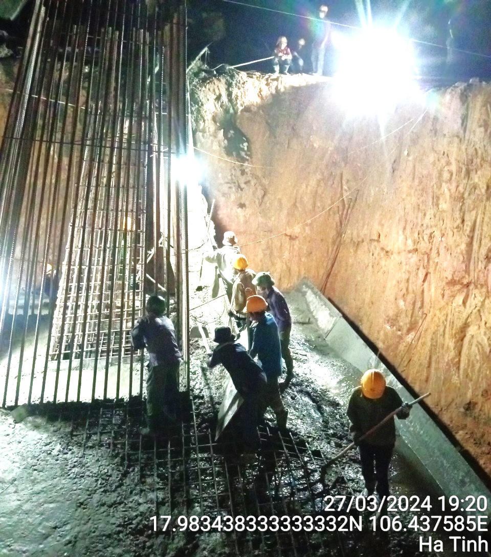 Tranh thủ thời tiết khô ráo, việc đổ bê tông diễn ra bất kể ngày hay đêm để đảm bảo tiến độ hoàn thành toàn bộ việc đúc móng trước 30/4/2024. (Ảnh: đổ bê tông mố rùa vị trí 22, Gói thầu số 11). |