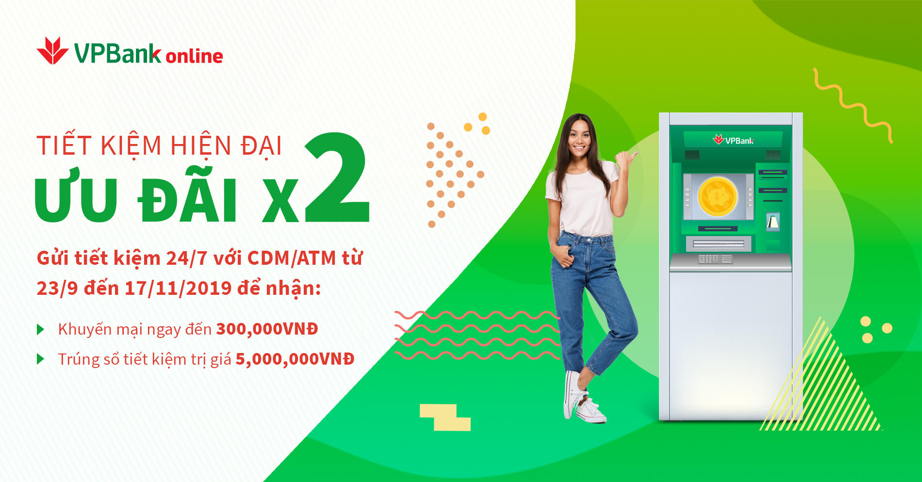 Được biết, từ ngày 23/9 đến hết ngày 17/11/2019, VPBank triển khai chương trình “Tiết kiệm hiện đại - Ưu đãi nhân hai”. Khách hàng lần đầu tiên gửi tiết kiệm trực tuyến tại CDM/ATM với số tiền trên 30 triệu VNĐ kỳ hạn 6 tháng trở lên sẽ được nhận ngay tiền thưởng khuyến mãi. Số tiền này sẽ được chuyển vào tài khoản của khách hàng trong vòng 7 ngày làm việc kể từ khi khách hàng gửi tiết kiệm thành công.