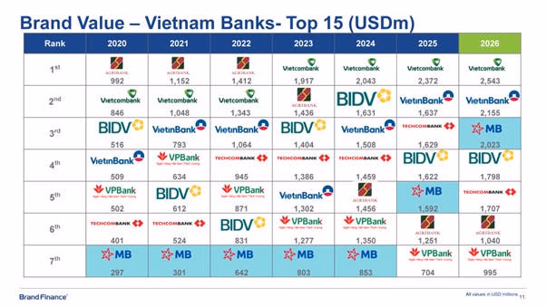 ● Giá trị thương hiệu đạt 2,023 tỷ USD, tăng 27% so với năm 2025, thuộc Top 3 thương hiệu ngân hàng giá trị nhất Việt Nam.