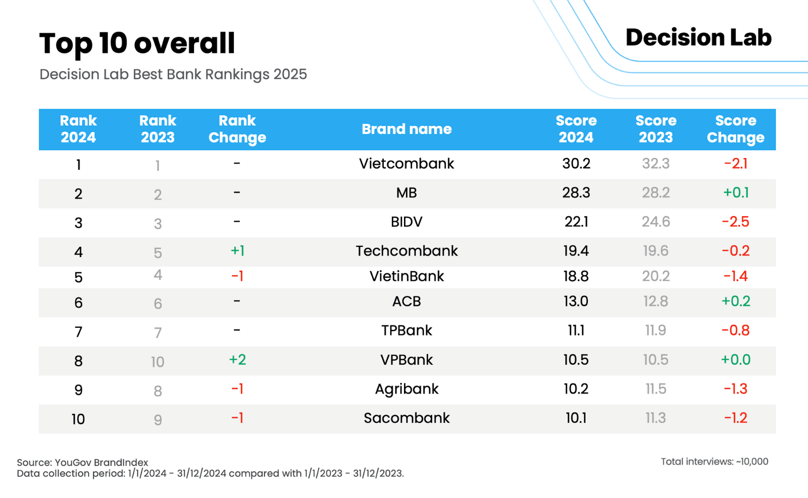 Decision là tổ chức nghiên cứu hành vi tiêu dùng hàng đầu, ứng dụng khoa học dữ liệu để đánh giá thương hiệu. Bảng xếp hạng Ngân hàng Tốt nhất của Decision Lab dựa trên các tiêu chí: Ấn tượng, Chất lượng, Giá trị, Hài lòng, Đề xuất và Danh tiếng, phản ánh sự tín nhiệm của khách hàng đối với các ngân hàng.