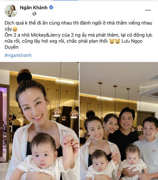 “Dịch quá không thể đi ăn cùng nhau thì đành ngồi ở nhà thăm viếng nhau vậy. Ôm hai nhỏ Mickey & Jerry của hai người ấy mà phát thèm, lại có động lực nữa rồi, cũng lấy hơi xong rồi, chắc phải lên kế hoạch thôi”, Ngân Khánh viết.