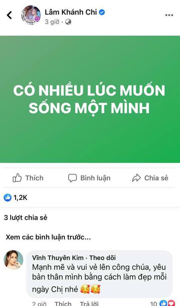 Chiều 5/8, Lâm Khánh Chi bất ngờ đăng tải dòng trạng thái tuyên bố muốn sống một mình, ca sĩ Vĩnh Thuyên Kim động viên đàn chị |