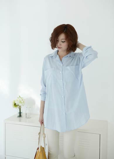 Áo sơ mi dáng dài là một gợi ý không tồi cho các mẹ bỉm sữa. Bạn có thể phối cùng quần skinny tối màu vừa giúp che phần eo lại tạo độ thon gọn cho đôi chân. Tất nhiên muốn kéo dài đôi chân bạn nên chọn thêm giầy cao gót, mũi nhọn và đồng màu với quần.