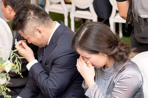 Mẹ chồng của Á hậu nở nụ cười khi trao quà cưới cho con dâu. Trong lúc ấy, chồng trẻ Tú Anh rơi nước mắt vì cảm động.