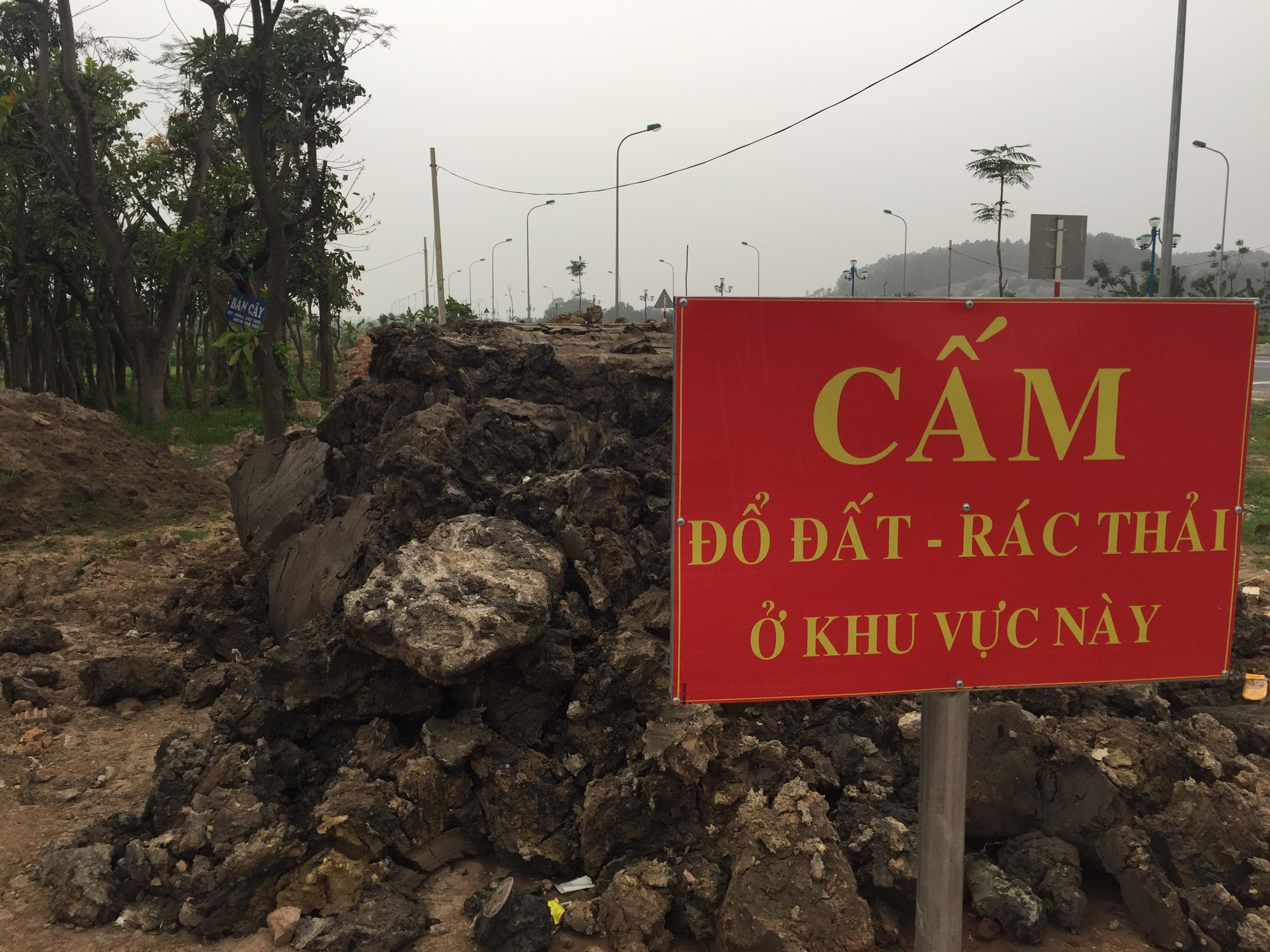 | Chính quyền xã Tam Đồng đã cắm biển cấm đổ đất, rác thải nhưng dường như chỉ mang tính hình thức. Những lái xe tải không hề quan tâm và lại đổ đất tại địa điểm khác |