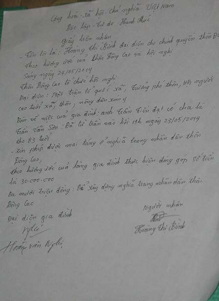 Theo giấy biên nhận, ghi bằng tay, ngày 24/5/2014, do bà Hoàng Thị Bình - đại diện thôn Đông Cao ký nhận, số tiền 30 triệu đồng nói trên là "Để xây dựng nghĩa trang nhân dân thôn Đông Cao".