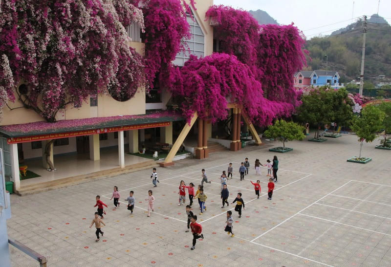 Nhiều người đến Trường mầm non Lò Văn Giá, tại bản Cọ (phường Chiềng An, Tp Sơn La, Sơn La) đều ngỡ ngàng trước khung cảnh tuyệt đẹp với những giàn hoa giấy nở đẹp rực rỡ, đủ sắc màu phủ quanh trường học.