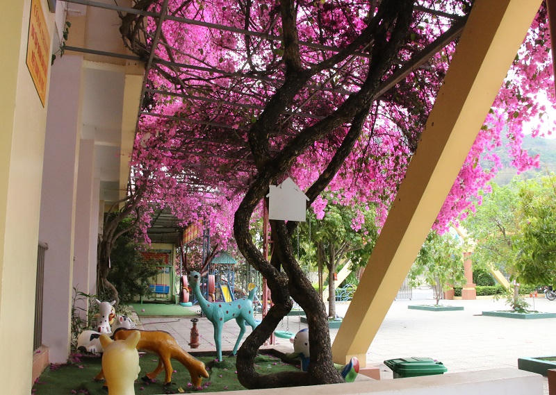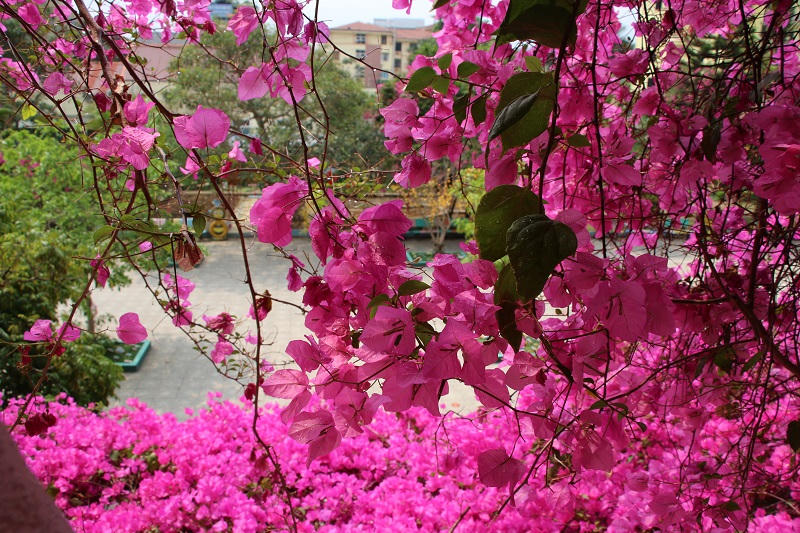 Những giàn hoa giấy làm cho khung cảnh sân trường đẹp tựa như tranh vẽ.