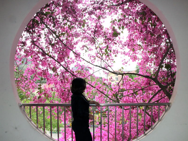 Mê mẩn ngắm giàn hoa giấy nở đẹp rực rỡ phủ quanh trường học