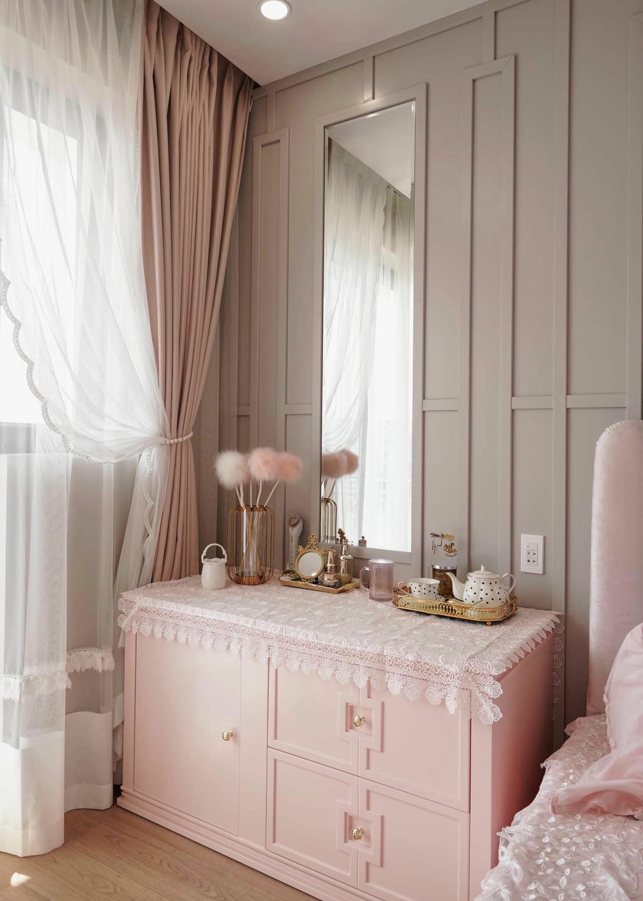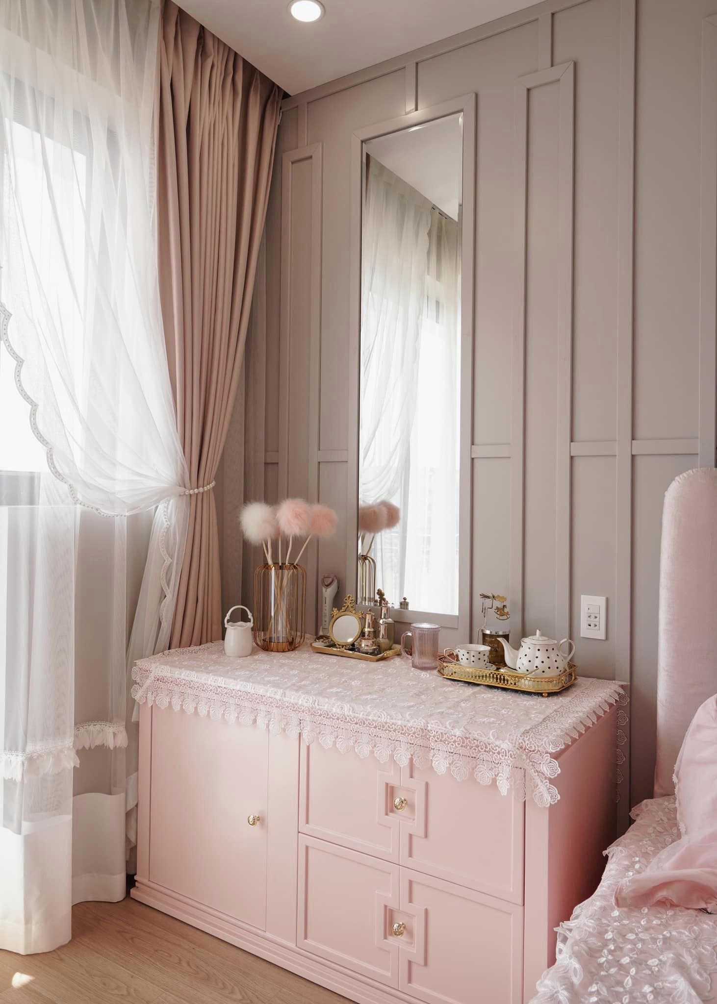 Bàn phấn phiên bản kết hợp tủ đầu giường… cũng vô cùng xinh xắn với gam màu hồng. |