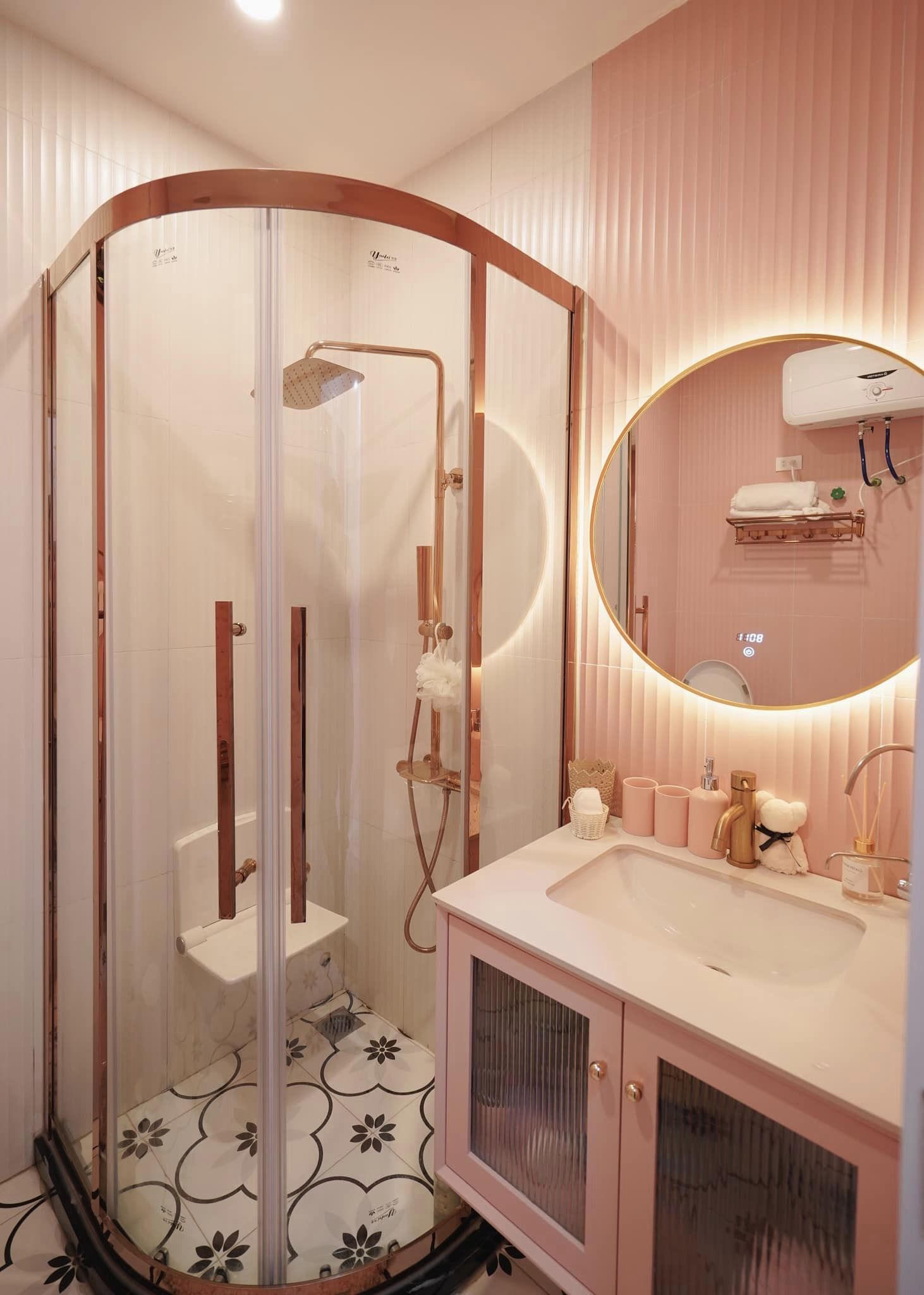 Quả thực cái tên "cô gái nghiện màu hồng" thật không sai với Hà My. Bên trong không gian phòng tắm, cũng được cô sắp xếp, decor cùng tông màu hồng. Mọi thứ đều nhỏ gọn, ngăn nắp, dễ thương. |