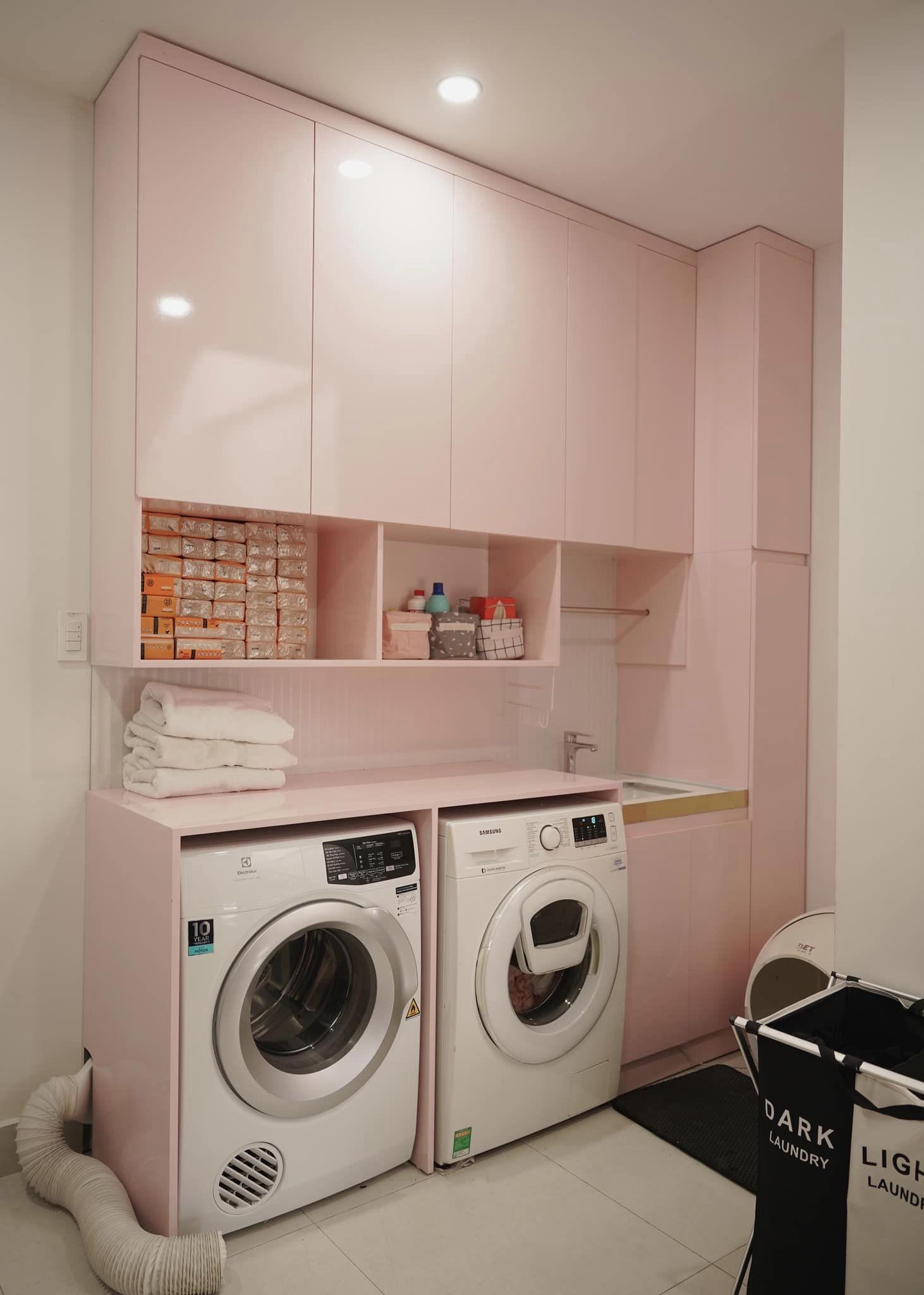 Thậm chí cả máy giặt cũng được đặt trong lồng đựng màu hồng. |