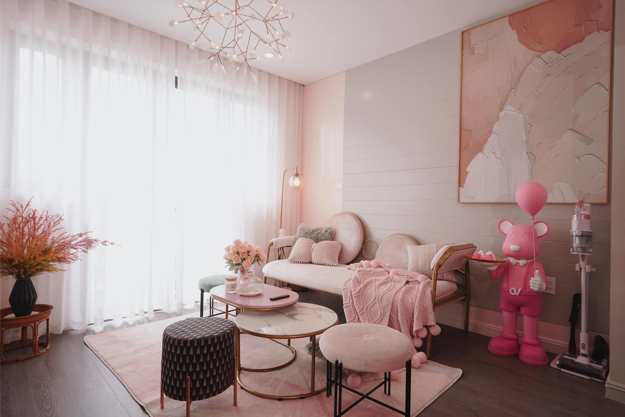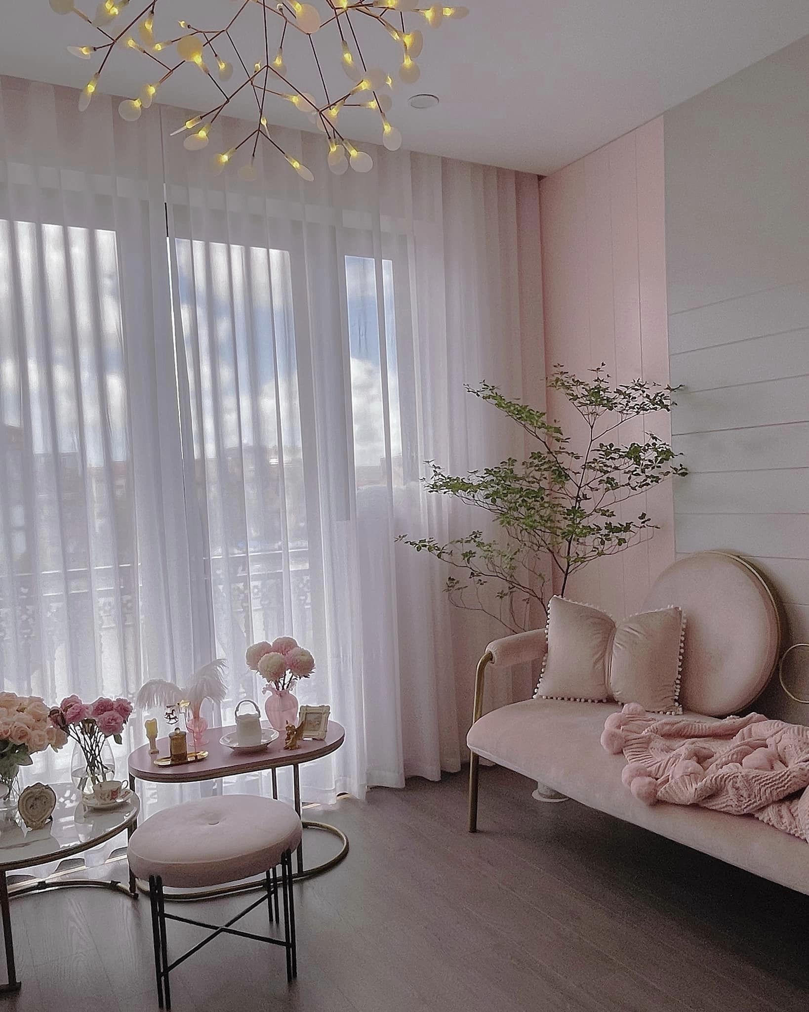 Bên trong phòng khách, được thiết kế khá tối giản, với tông màu hồng chủ đạo. |
