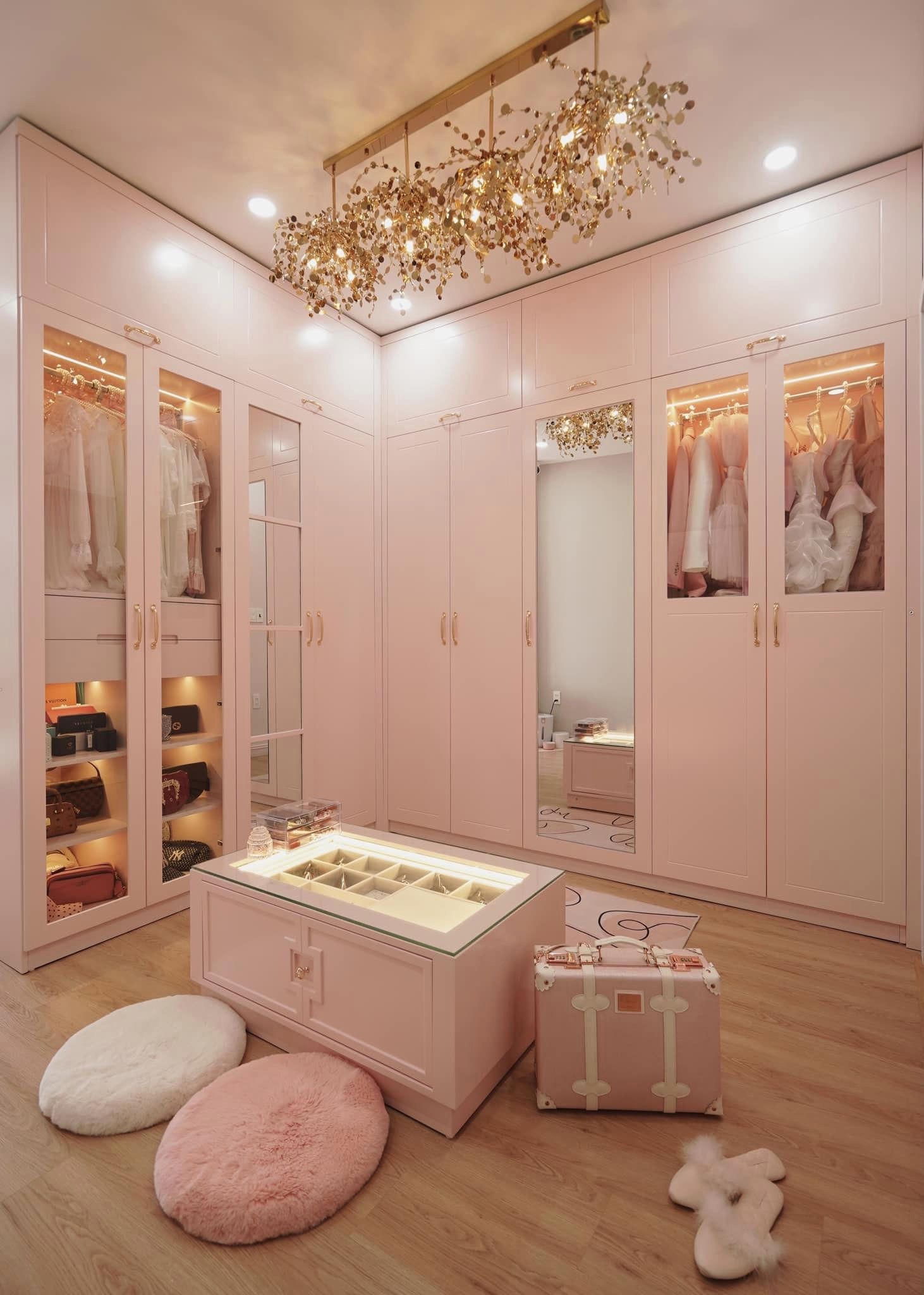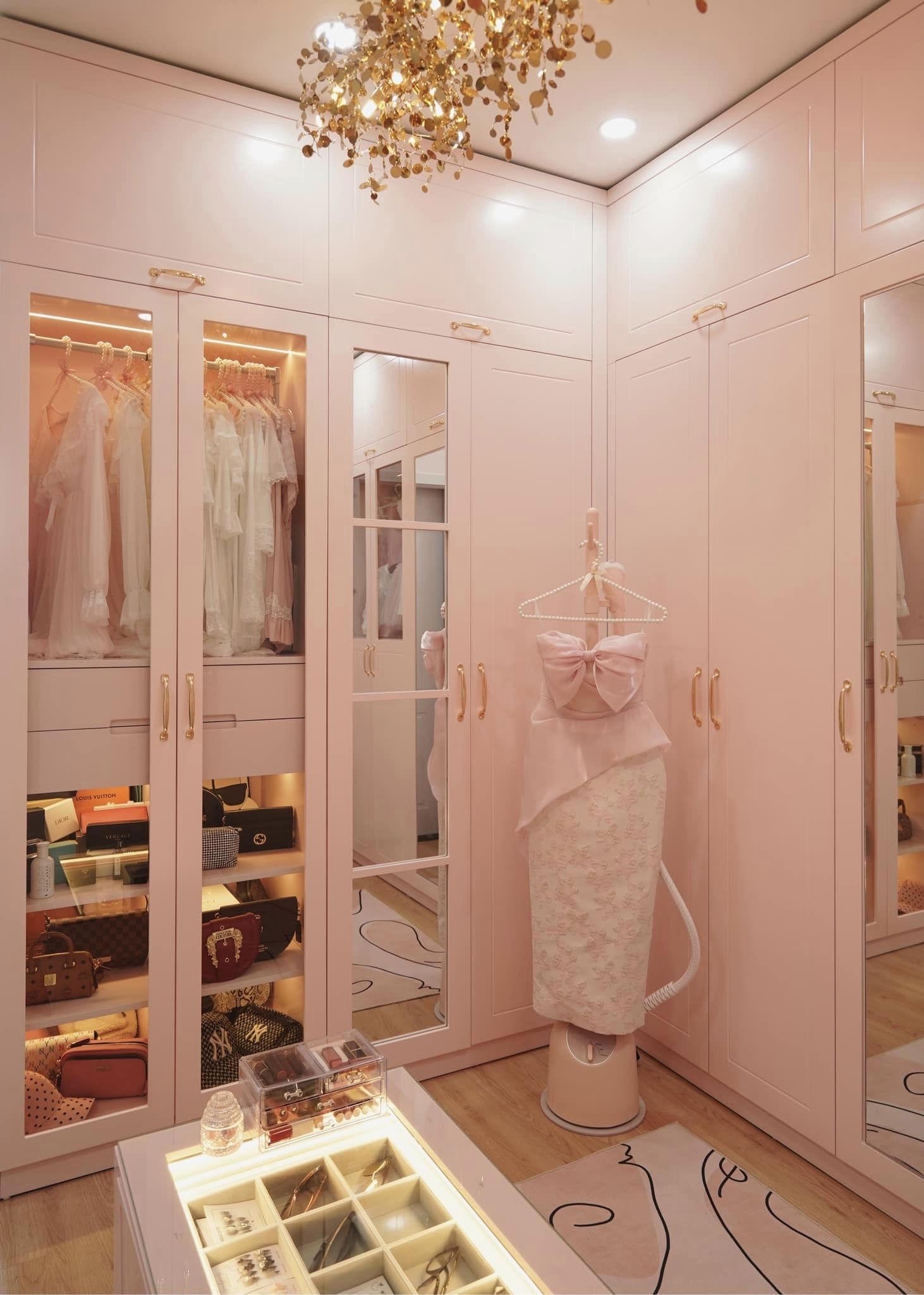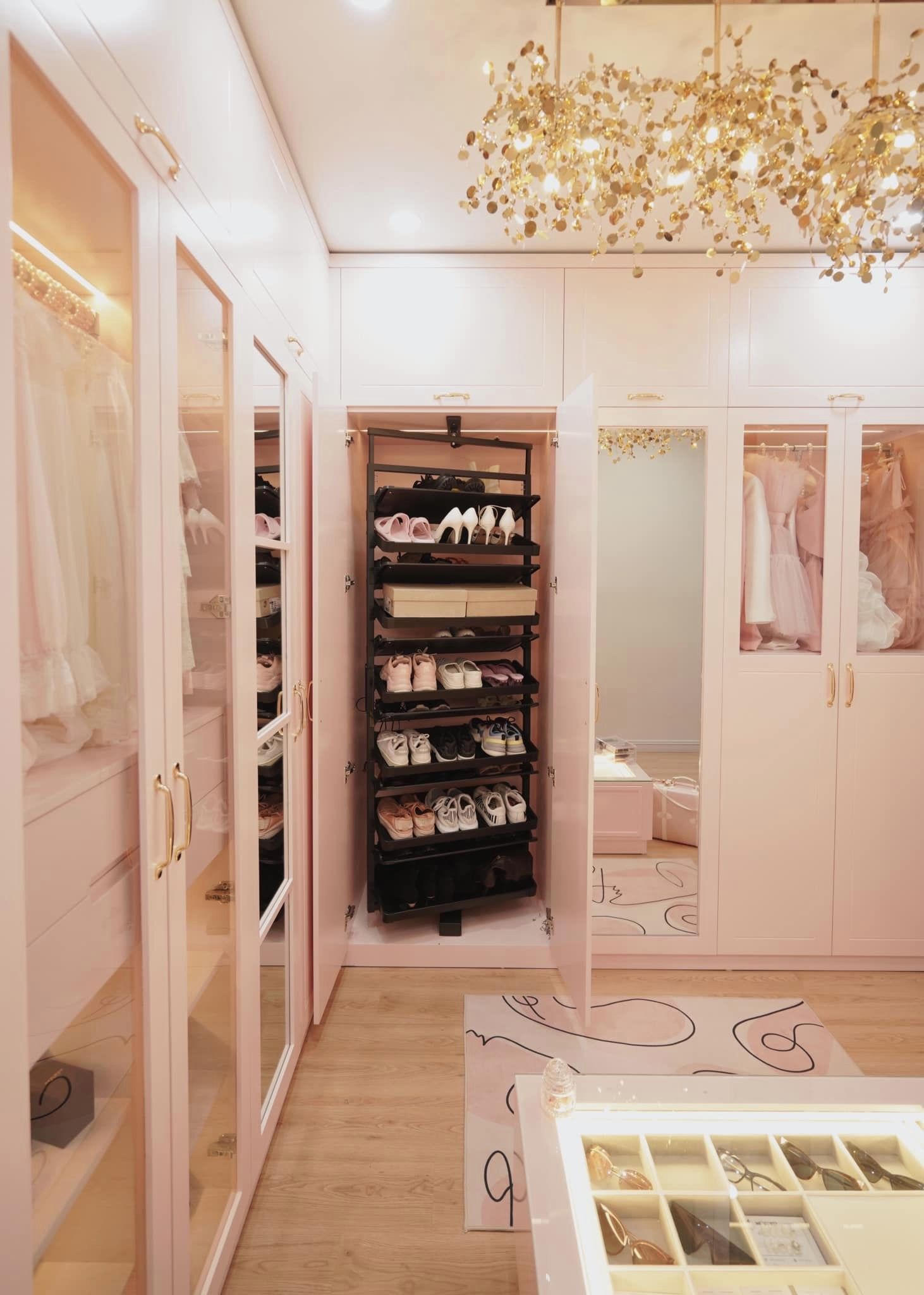 Phòng thay đồ của cô gái mê màu hồng với điểm nhấn là chiếc tủ 9 cánh. |