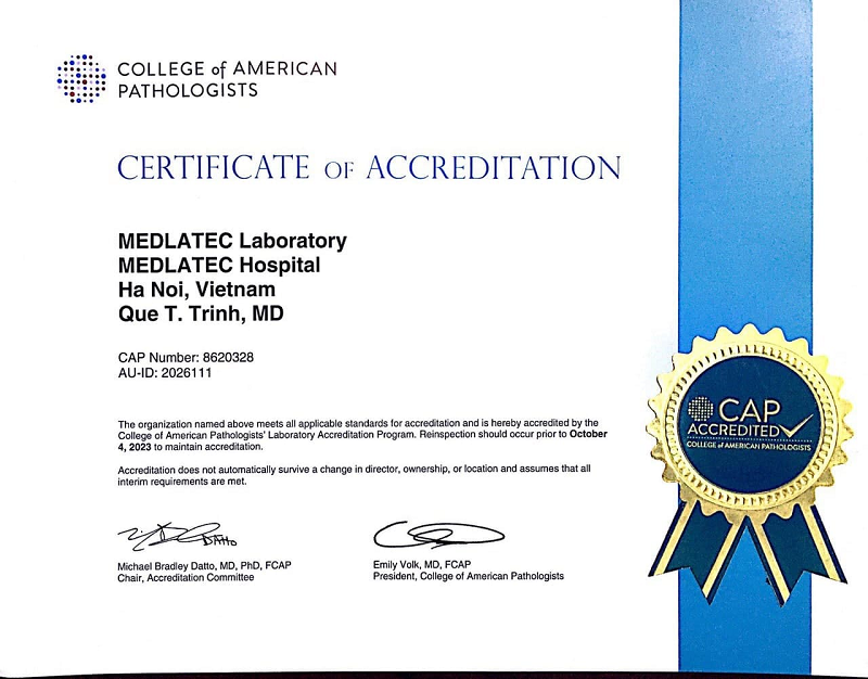 Chất lượng xét nghiệm của MEDLATEC từ lâu đã khẳng định vị thế trong nước và quốc tế. Năm 2022, Trung tâm Xét nghiệm MEDLATEC tự hào trở thành đơn vị y tế đầu tiên tại Việt Nam đạt chứng nhận CAP - tiêu chuẩn uy tín về chất lượng phòng xét nghiệm do Hiệp hội Bệnh học Hoa Kỳ (College of American Pathologists) cấp. Trước đó, vào năm 2016, MEDLATEC đã lần đầu tiên đạt chứng nhận ISO 15189:2012, xác nhận năng lực và chất lượng của phòng xét nghiệm y tế. Đến nay, Trung tâm Xét nghiệm MEDLATEC đã duy trì liên tục tiêu chuẩn ISO 15189:2012 suốt 8 năm, luôn được đánh giá cao trong việc đảm bảo và nâng cao chất lượng xét nghiệm.
