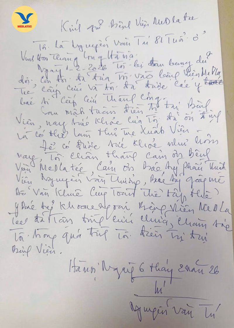 “Ngày 1/2/2026, tôi bị đau bụng dữ dội, con tôi đã đưa tôi vào Bệnh viện MEDLATEC cấp cứu. Và tôi đã được các y bác sĩ cấp cứu thành công... Để có được sức khỏe như hôm nay, tôi chân thành cảm ơn Bệnh viện MEDLATEC, cảm ơn bác sĩ phẫu thuật Nguyễn Văn Thưởng, bác sĩ gây mê Đỗ Văn Khuê cùng toàn thể tập thể y bác sĩ khoa ngoại, Bệnh viện MEDLATEC đã tận tình cứu chữa, chăm sóc tôi trong quá trình tôi điều trị tại bệnh viện", cụ Tú chia sẻ.