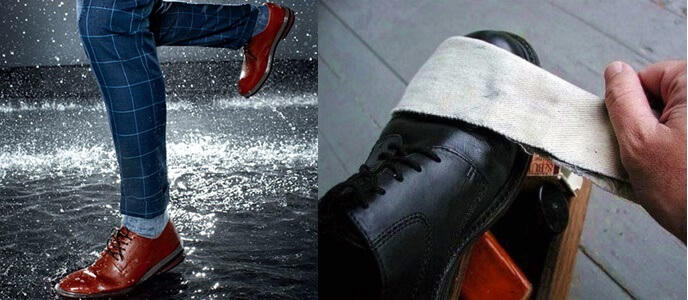 Đối với giày bị thấm nước mưa, bạn dùng vải ướt lau hết bùn đất rồi dùng vải khô lau lại một lượt, sau đó đánh xi rồi nhét báo vào giày, làm như vậy vừa để báo hút nước vừa để giữ cho đôi giày không bị biến dạng. Cuối cùng đặt đôi giày lên trên giấy báo để khô.