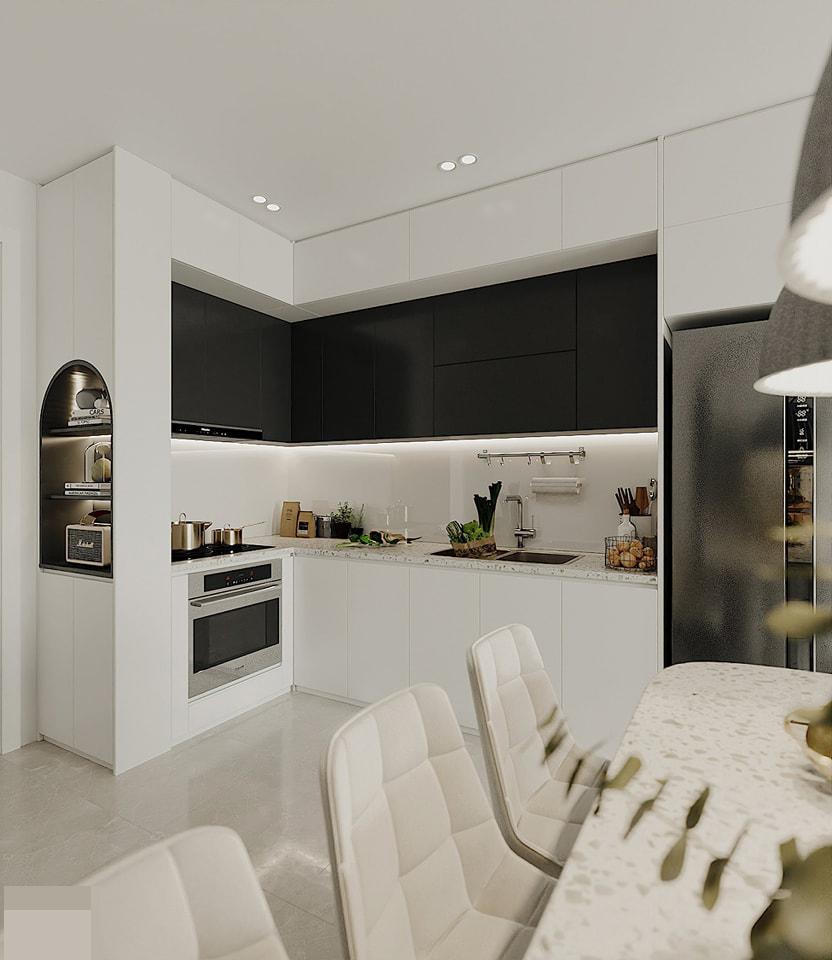 Ngoài ra, nếu bạn không quá chú trọng phong thủy, mà lựa chọn màu bếp theo sở thích có thể xem xét đến gam màu trắng. Đây là gam màu chủ đạo dành riêng cho thiết kế nhà bếp diện tích nhỏ. Vì nó sẽ mang đến 1 không gian sang trọng, rộng rãi và tiện nghi hơn cho ngôi nhà của bạn.