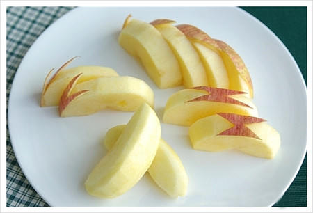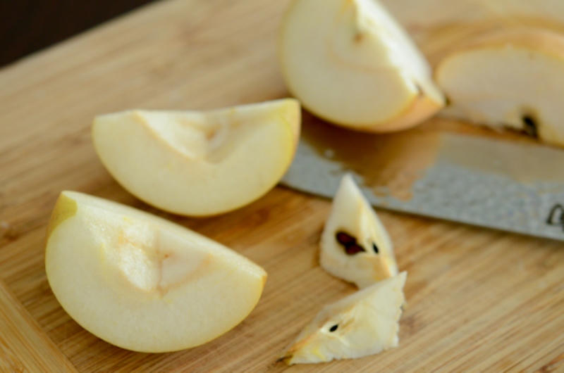 Cắt lê, táo thành miếng nhỏ rồi để vào một bát nước muối trong vài giây.