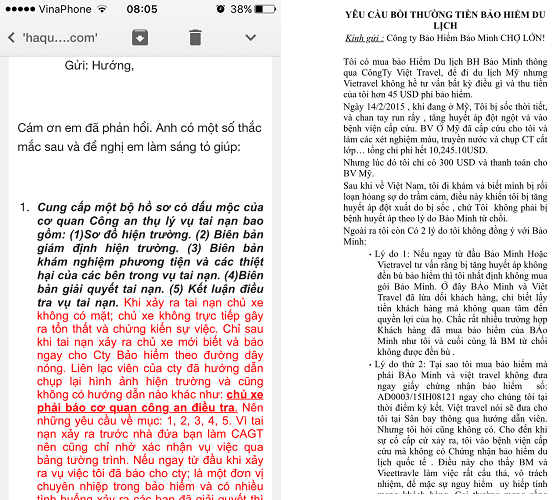 Khi về Việt Nam, anh đưa phiếu yêu cầu thanh toán nhưng Bảo Minh không đồng ý. Nhùng nhằng hơn 1 năm, anh Minh khiếu nại thì Bảo Minh yêu cầu anh gửi bệnh án của bệnh viện tại Hoa Kỳ để xem xét. Sau khi nghiên cứu, Bảo Minh thông báo: “Qua xem xét hồ sơ bệnh án và quá trình điều trị tại Mỹ ngày 14/02/2015 của quý ông có các thông số sau: Hypoglycemia (bị hạ đường huyết), electrolyte abnormality (rối loạn cân bằng nước điện giải), cardiac arrhythmia (chứng rối loạn nhịp tim).