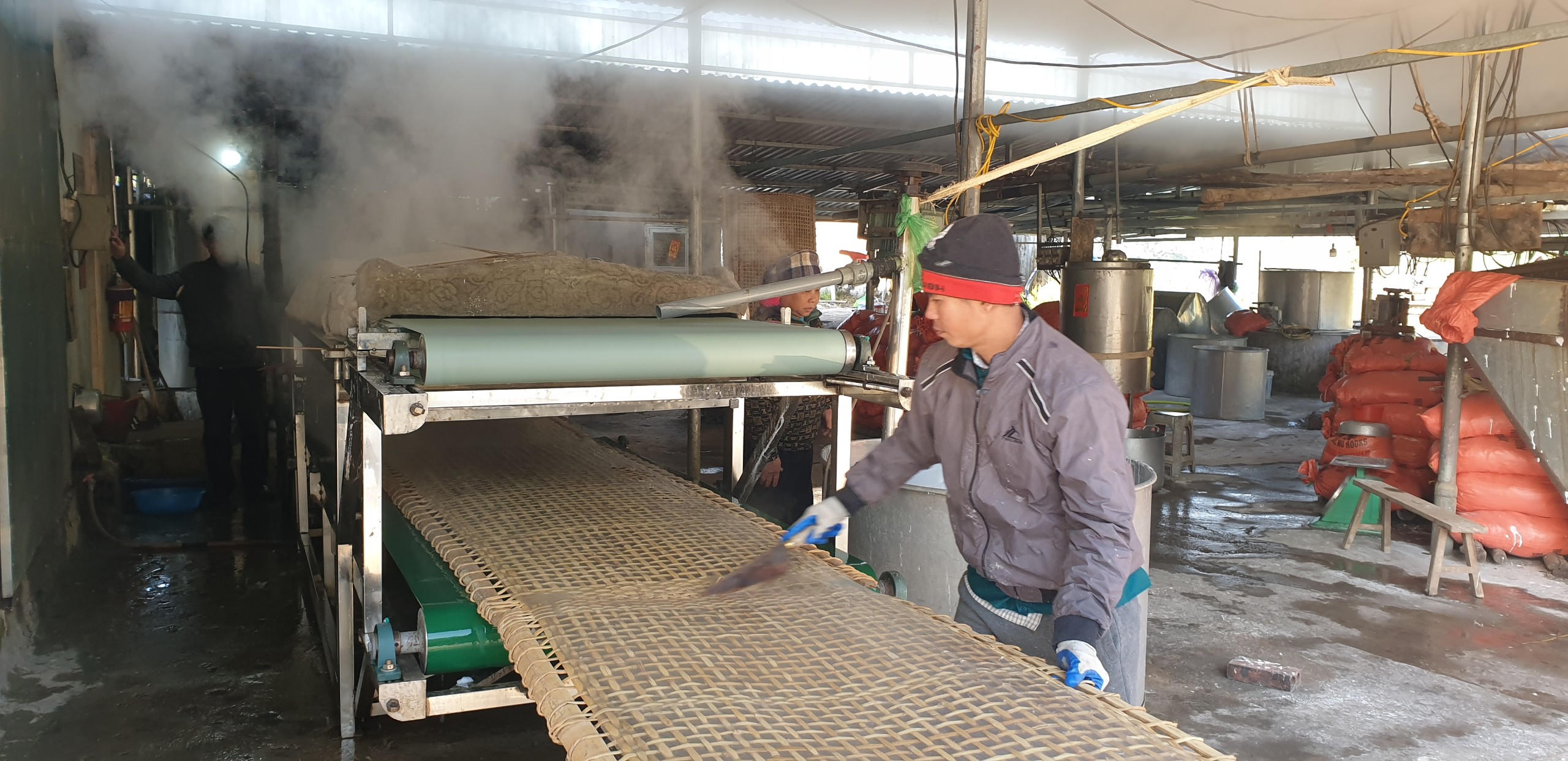 | Tinh bột dong được lọc sạch tạp chất, qua bồn hấp, sau đó qua máy cán tạo lên bánh dong. Ảnh: Quang Hà |