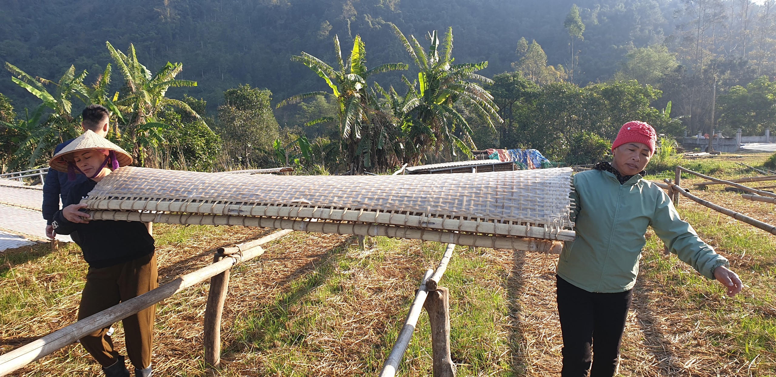 Trong khi phơi dưới ánh nắng tự nhiên, bánh dong sẽ được trở mặt để đạt được độ khô vừa phải. Ảnh: Quang Hà |