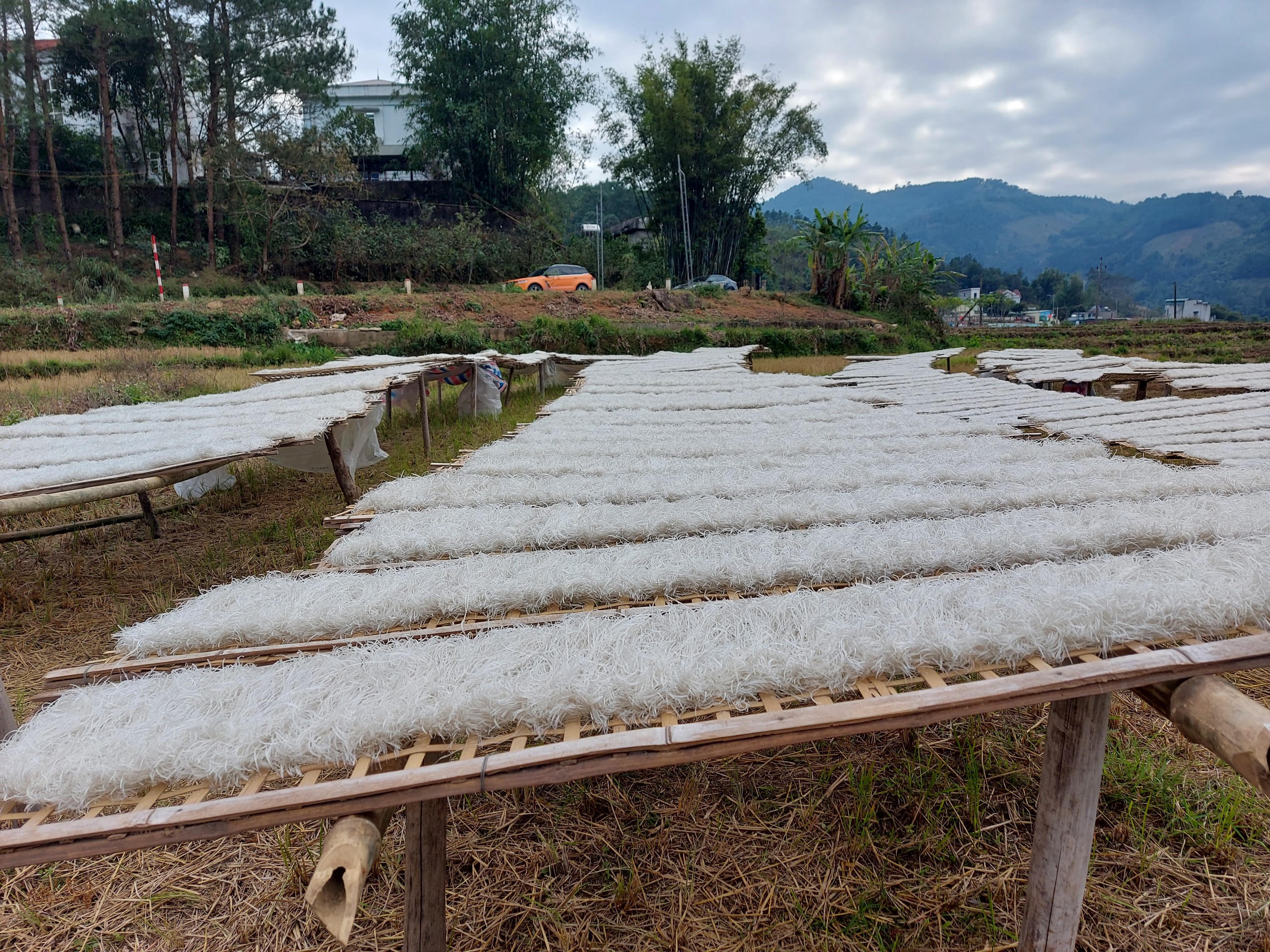 Những cánh đồng sau thu hoạch được tận dụng làm sân phơi miến. Ảnh: Quang Hà |