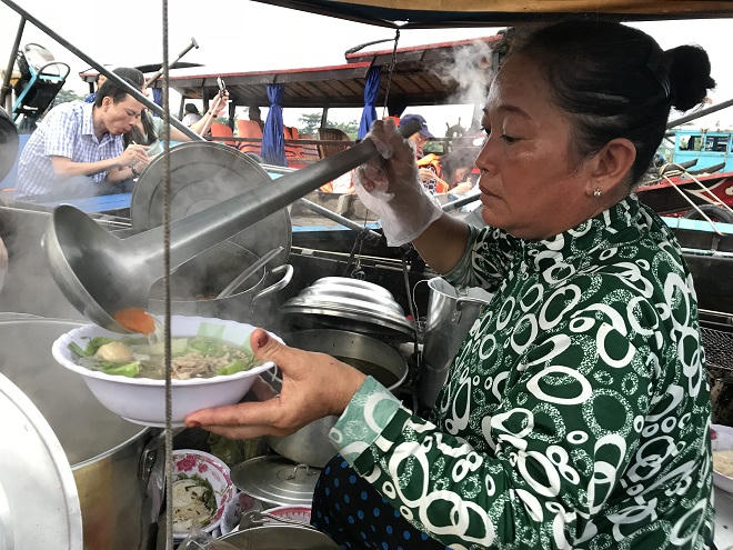 Điểm tấp nập, rộn ràng nhất của chợ nổi lúc bấy giờ là “quán” bán đồ ăn sáng của dì Bảy, nằm ngay giữa sông. Ghe chúng tôi cũng ghé lại đó, thưởng thức bữa sáng trước khi tiếp tục hành trình.