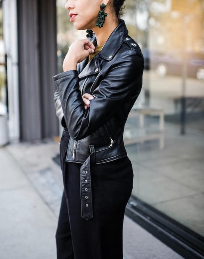 Khuyên tai statement + áo khoác moto jacket + quần culottes cạp cao