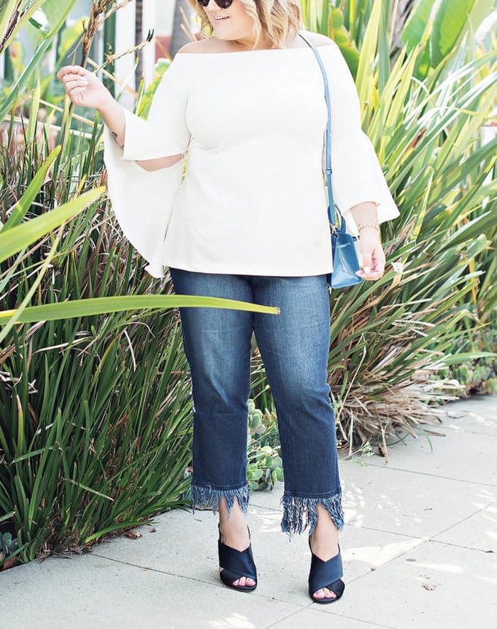 Áo trễ vai + quần jeans cắt gấu + giày cao gót