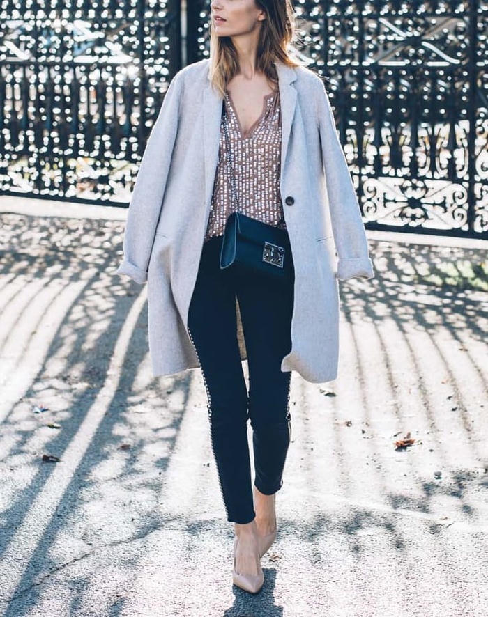 Quần skinny kết hợp cùng áo khoác dáng dài tạo nên phong cách thanh lịch mà vẫn sành điệu. Diện cùng áo thun nạm đinh mang vẻ diện mạo trẻ trung, "chất lừ" cho phái đẹp.