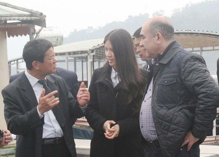 | Phó Thủ tướng kiêm Bộ trưởng Bộ Nông nghiệp và Nguồn nước Uzbekistan, ngài Mirzaev Zoiyr trong một lần tham quan trang trại cá Tầm ở hồ Đà Bắc |
