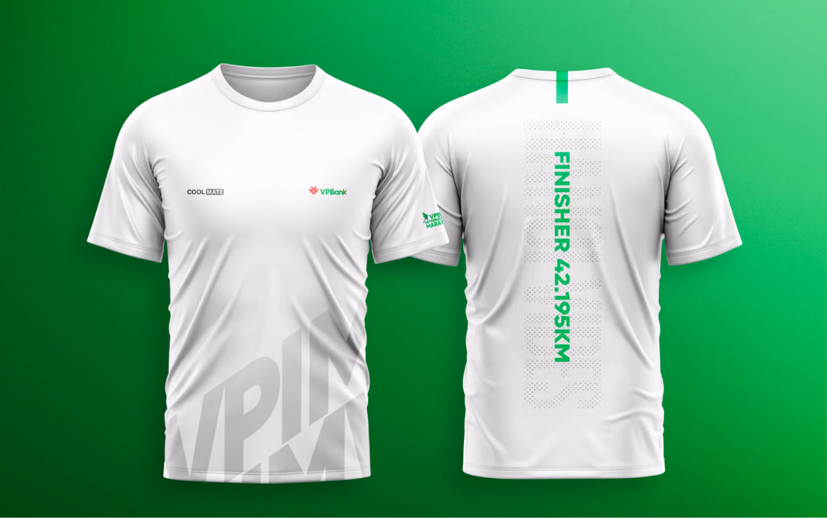 Nổi bật trong bộ race kit là chiếc áo đấu mang sắc xanh lá chủ đạo, được sản xuất bởi Coolmate - thương hiệu thời trang thể thao nội địa đang phát triển mạnh mẽ và quen thuộc với cộng đồng runner trên toàn quốc.