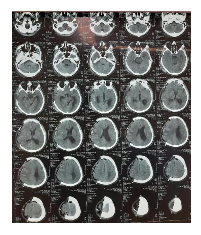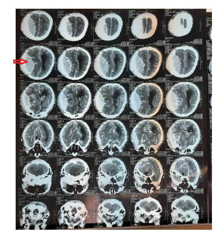 Kết quả chẩn đoán cho thấy bệnh nhân bị u màng não bán cầu (P) kích thước: 10 × 9 × 4cm, khối u gây tăng sinh xương, cơ thái dương và nhiều mạch máu, chèn ép nhu mô não, phù não nặng. Bệnh nhân được chỉ định phẫu thuật cấp cứu với phương pháp mở sọ và vi phẫu lấy trọn u.