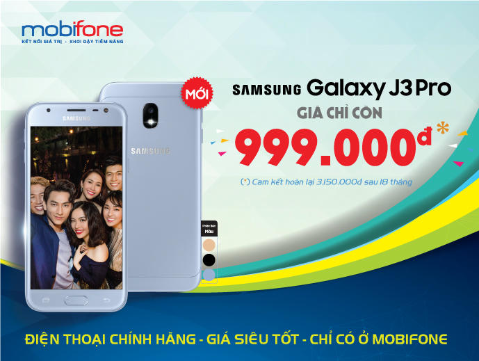 Từ ngày 4/8, chỉ với 999.000 đồng và đăng ký gói cước M199, khách hàng sẽ nhận được ngay một chiếc điện thoại Samsung Galaxy J3 Pro, đi kèm với gói nghe gọi nội mạng 300 phút, 3 GB dung lượng tốc độ cao 4G mỗi tháng với mức cước hàng tháng chỉ 199.000 đồng trong vòng 18 tháng.