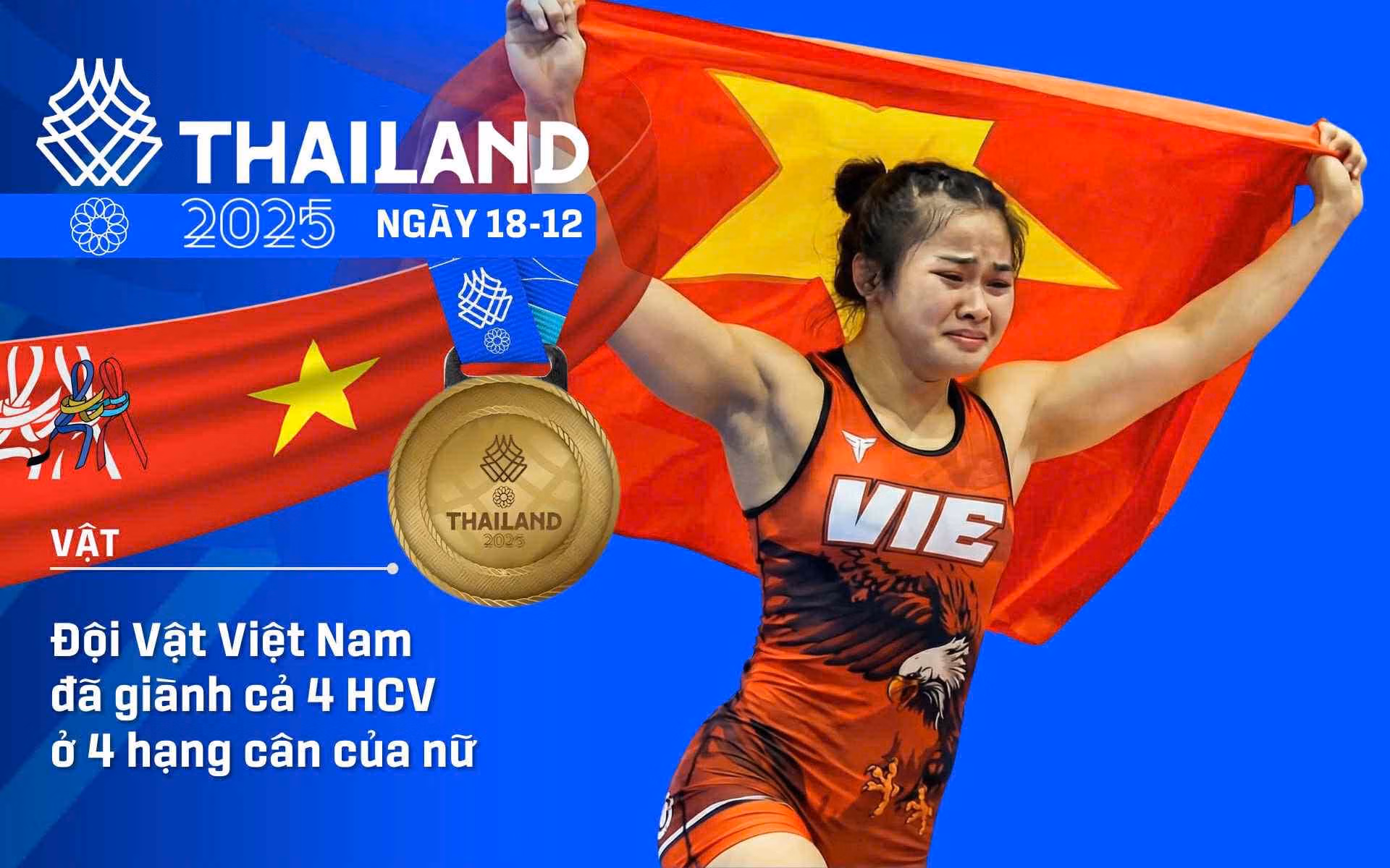 Mốc son vàng của Đoàn Thể thao Việt Nam trong ngày thi đấu 18/12 được tạo nên từ những tấm HCV quý giá ở các môn Triathlon, Vật, Đua thuyền rồng, Cầu mây, Futsal và Bóng đá nam.