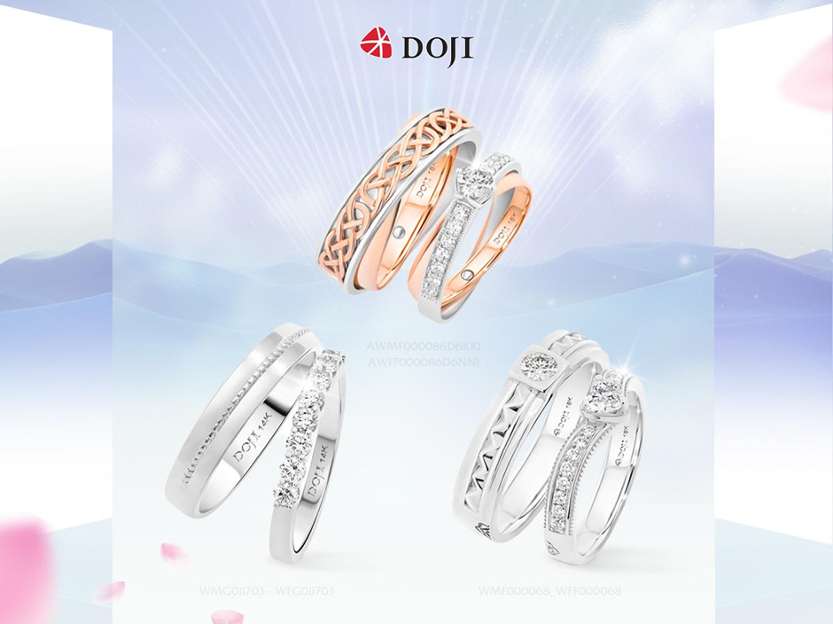 Nổi bật trong các BST nhẫn cưới của DOJI có BST Loving Heart, BST Only Love và BST Happy Journey. Mỗi bộ sưu tập mang một ý nghĩa riêng biệt. BST Loving Heart giới thiệu nhẫn kim cương 99 giác cắt như một tuyệt phẩm hội tụ những kỹ thuật đính đá và gia công tinh xảo, thể hiện thông điệp đẹp đẽ nhất về tình yêu vĩnh cửu. BST Only Love với thiết kế đơn giản, tinh tế kết hợp với viên chủ kim cương tự nhiên duy nhất biểu trưng cho một lời ước hẹn của tình yêu đôi lứa. Trong khi đó, BST Happy Journey lại là lời cam kết của cặp đôi cùng nhau tạo nên một hành trình hạnh phúc như câu nói “Hạnh phúc là hành trình chứ không phải đích đến”.