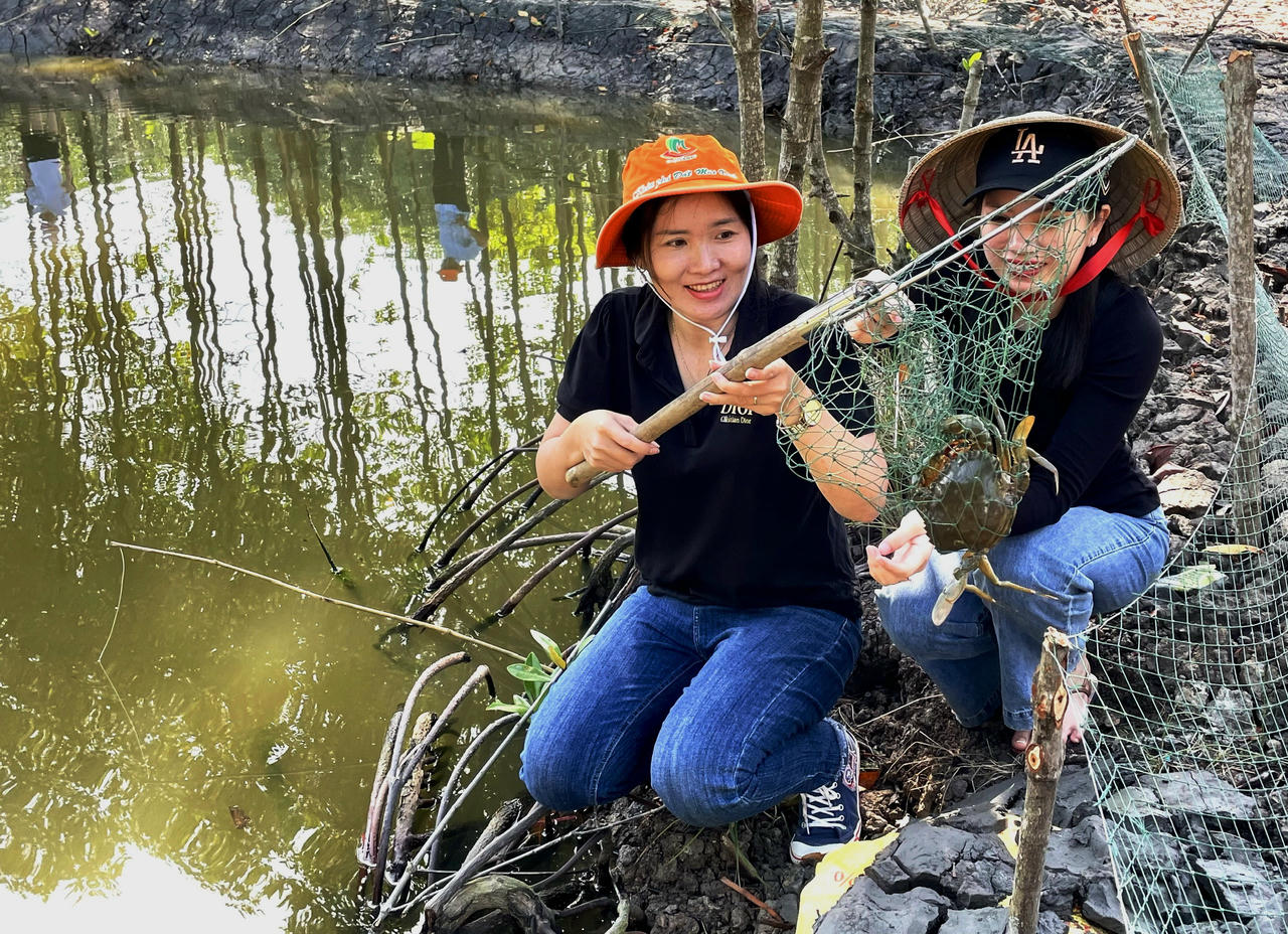 Đoàn vô rừng vuông tôm, đước, bắt cá, vợt cua, trói cua, tại khu du lịch sinh thái trải nghiệm Tư Tỵ (Khóm Tam Hiệp, thị trấn Rạch Gốc, huyện Ngọc Hiển, tỉnh Cà Mau). |