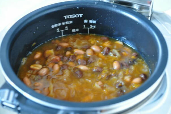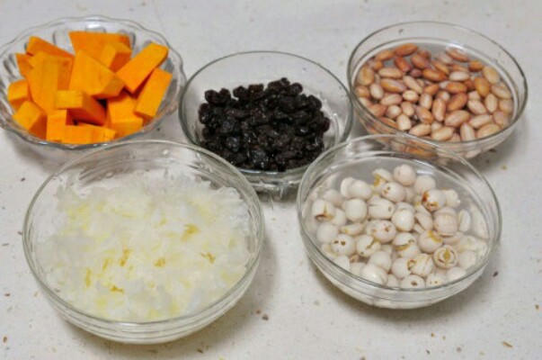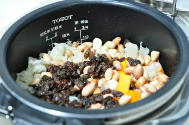 Cho hạt sen, lạc, nấm tuyết, nho khô, bí đỏ vào nồi cùng chút đường. Thêm lượng nước ngập mặt vào.