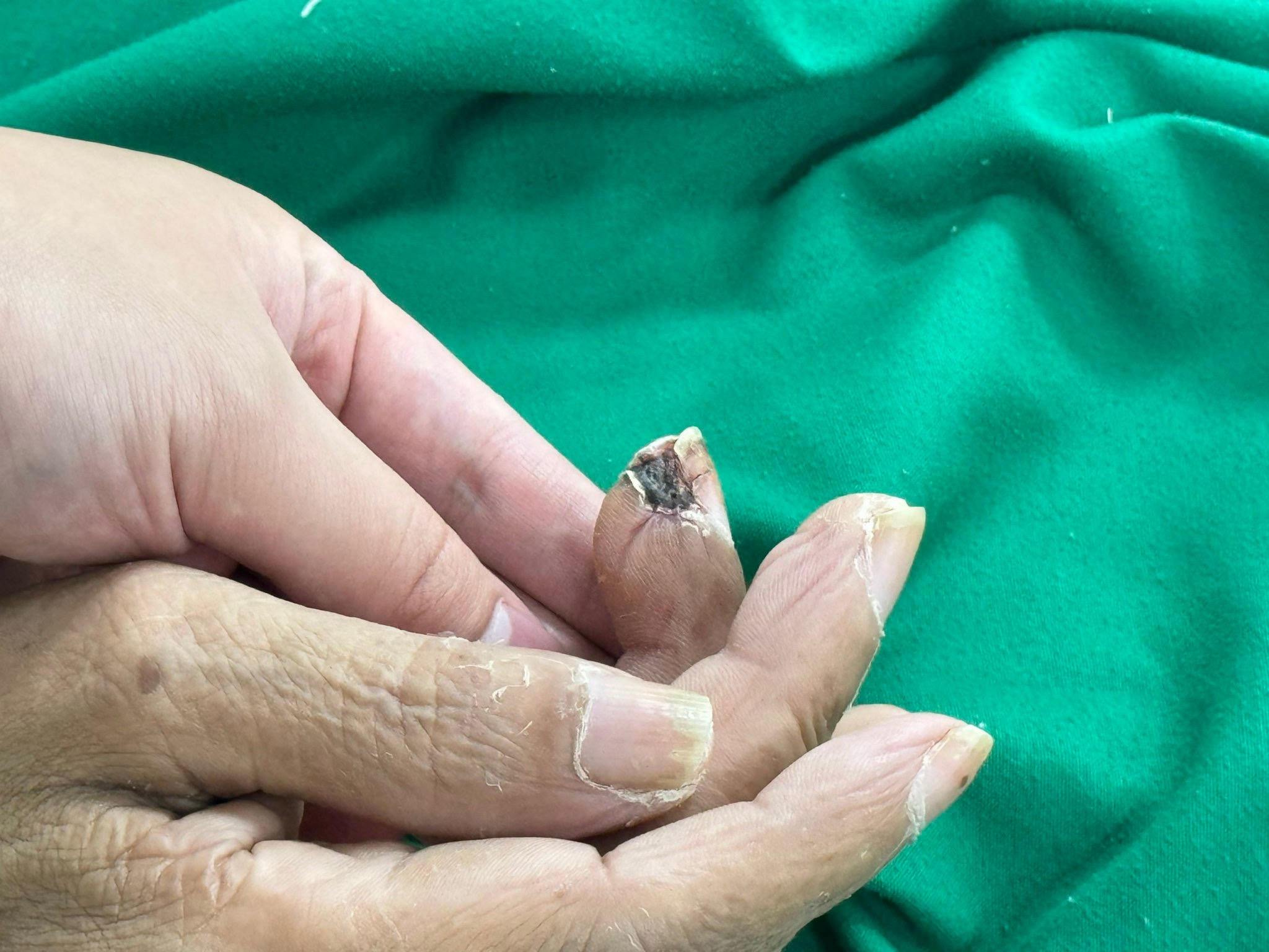 Trường hợp 4, bệnh nhân B.V.H (65 tuổi, ở Bắc Ninh) nhập viện ngày 27/6/2024. Bệnh nhân có tiền sử đái tháo đường và tăng huyết áp. Khoảng 8 ngày trước khi nhập viện, bệnh nhân bị mảnh gỗ đâm vào ngón tay phải và tự xử lý bằng nước và băng keo cá nhân, dẫn đến vết thương mưng mủ. Bệnh nhân đi khám tại cơ sở y tế trong tình trạng khó há miệng, cứng hàm sau đó được giới thiệu lên Bệnh viện Bệnh Nhiệt đới Trung ương vì nghi mắc uốn ván.