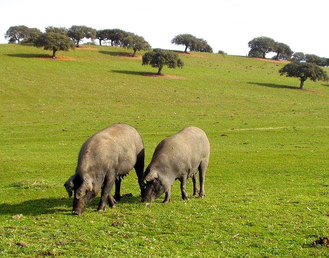 Giống heo đen được dùng để làm món Jamón Ibérico phải được nuôi kiểu chăn thả rông trên đồng cỏ xanh tươi với tiêu chuẩn đưa ra là không được quá 2 con heo trên mỗi hectare, để thịt heo được săn chắc và heo cũng phát triển tốt hơn.