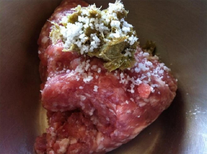 Đầu tiên, cho hỗn hợp tất cả nguyên liệu đã chuẩn bị ở trên vào và trộn đều, nhào nặn đến khi thịt xay ngấm các gia vị